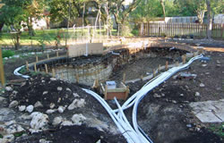 Before the gunite stage, plumbing and electrical components are installed. Plumbing lines are installed using schedule 40 PVC pipe. All plumbing lines are pressure tested to check for leaks and all electrical meets the necessary city and state codes.